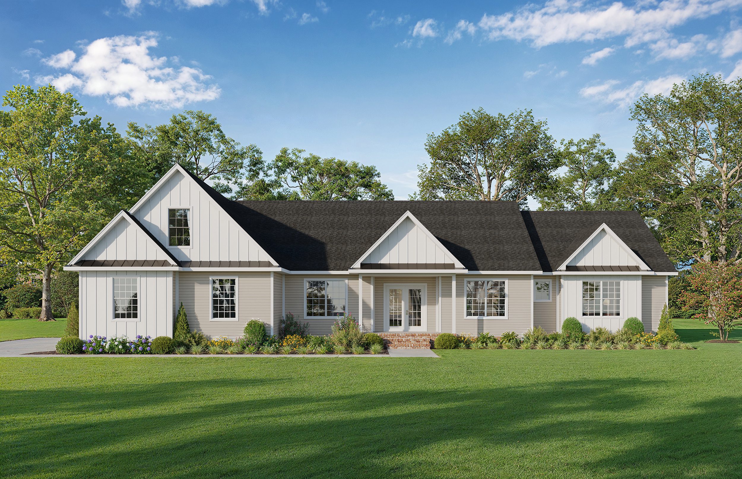 The Stonewall, a craftsman-style residence, combines traditional elegance with contemporary ease across its just 1880 square foot layout, featuring 3 bedrooms and 2 bathrooms. The design boasts an open floor plan with vaulted ceilings and expansive windows, ensuring a bright and welcoming environment. At its core, a generous wrap-around kitchen serves as a focal point for both cooking aficionados and social gatherings, offering plenty of storage and workspace. A master suite provides a tranquil haven, complete with an ensuite bathroom for ultimate relaxation. Additionally, two versatile bedrooms can adapt to family needs or serve as a home office. With its smart design emphasizing both aesthetics and utility, the Stonewall epitomizes modern living in a compact, comfortable package.